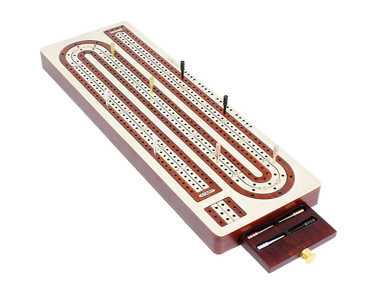 12 brass crib pegs (3 Gold, 3 Silver, 3 Copper, and 3 black plated) are provided with the board. The front part of the board has a very beautiful drawer to store twelve metal crib pegs. There are 12 slots in the pull-out drawer and each slot holds a single peg. The magnetic lock on the back of the drawer holds the drawer tightly when it is in the closed position and the brass knob on the front enhances the beauty of the board.