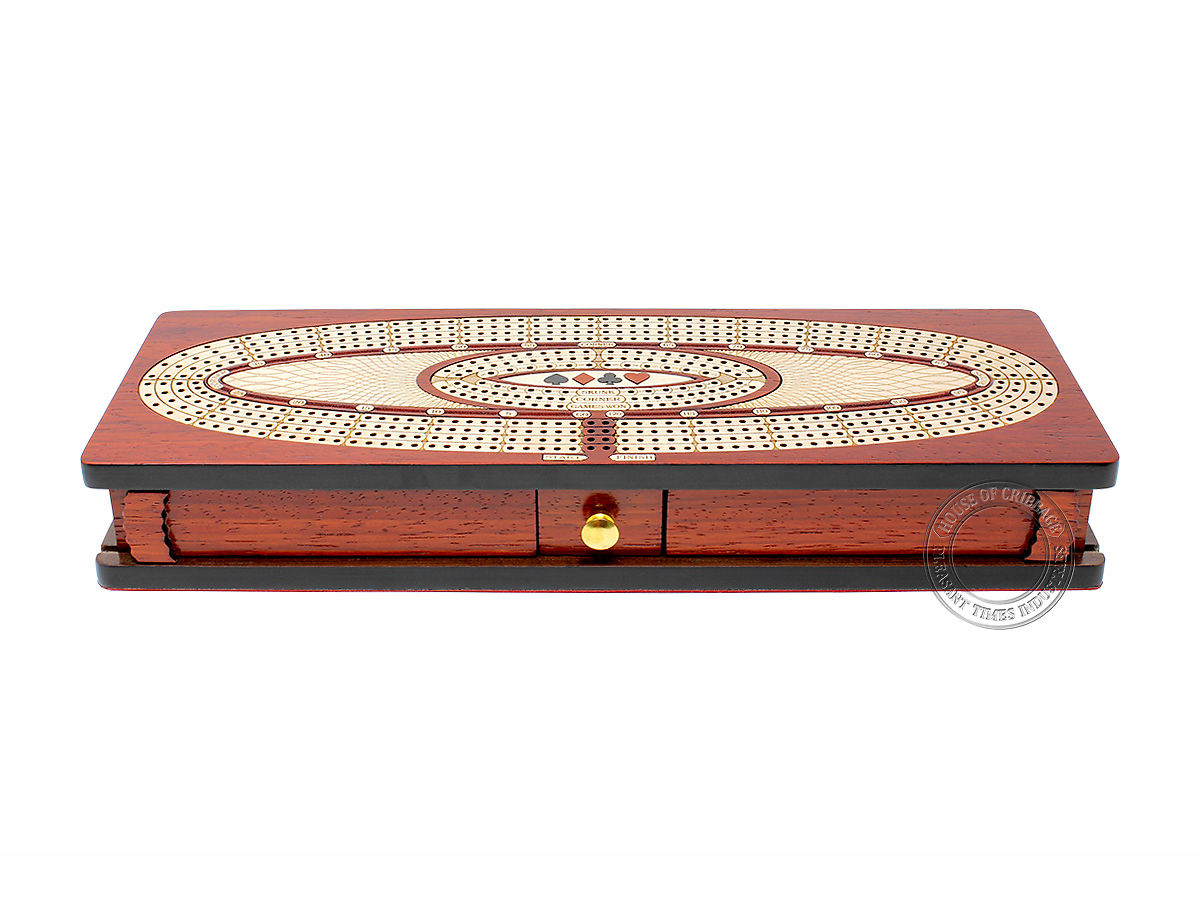 Continuous Cribbage Board Oval Shape 4 Tracks - Sliding Lid and Drawer with Skunks, Corners and Score Marking Fields - Bloodwood / Maple