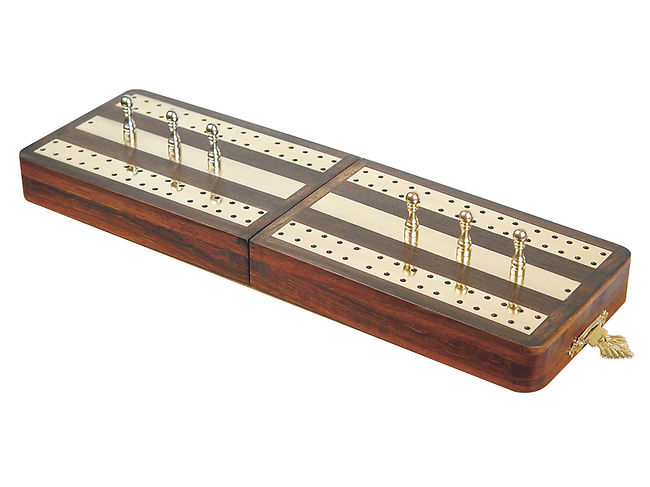 Cribbage Board Store presents exquisite 2 track (60 Points) Regular Design Regalia Cribbage Board & Box in Folding version. The handmade folding travel cribbage board/box is made of Rosewood and through special inlay process, brass tracks are inlaid on the board with great precision.