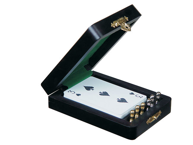The folding cribbage box provides storage space for 1 deck of playing cards and also separate section for 6 cribbage pegs. Soft green velvet felt has been applied inside the storage section.
