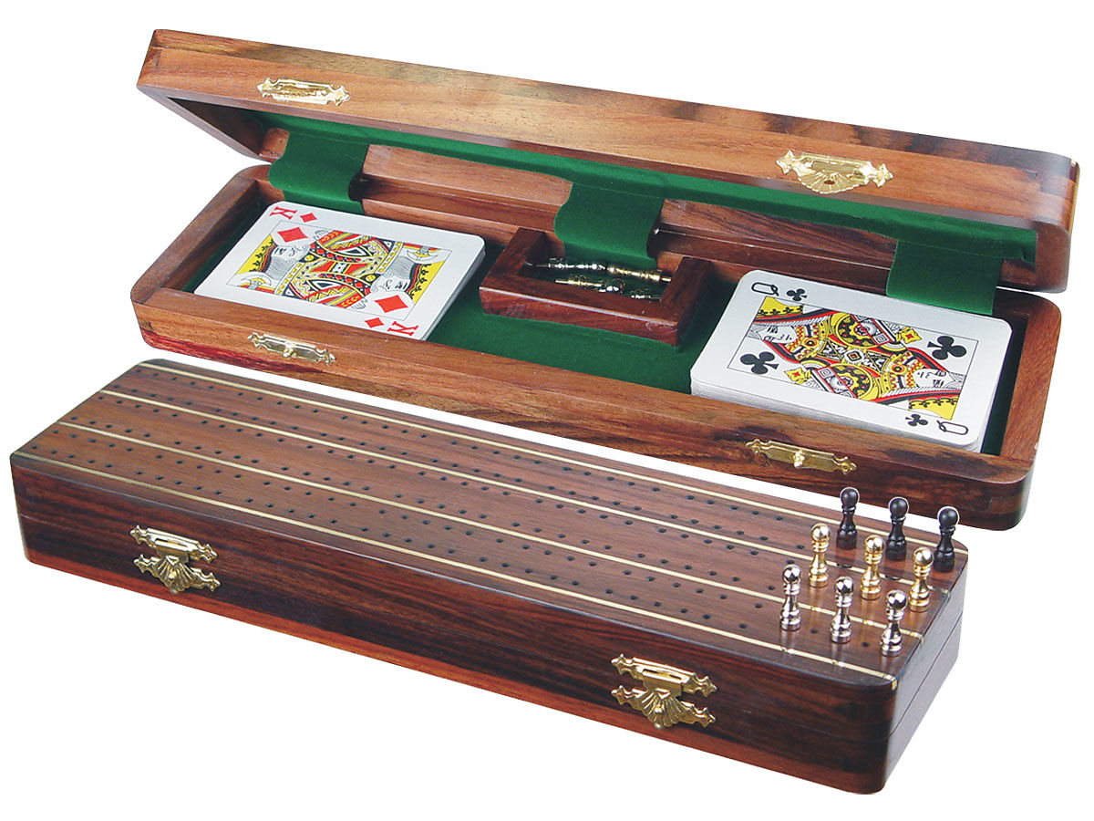 Cribbage Board Store presents exquisite 3 tracks (60 Points) Regular Design Supreme Cribbage Board & Box in Flat version. The handmade cribbage board/box is made of Rosewood and through special inlay process, Brass tracks are inlaid on the board with great precision and are leveled with box height for your ease of playing.