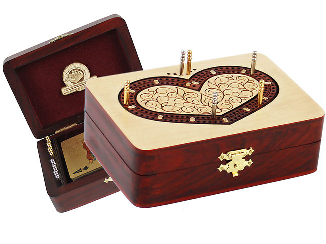 Cribbage Board Store presents exquisite 2 tracks (60 Points) wooden Cribbage Board & Box in Folding version. The handmade cribbage board is made of Maple and through special inlay process, Heart shape Bloodwood tracks are inlaid on the board with great precision.