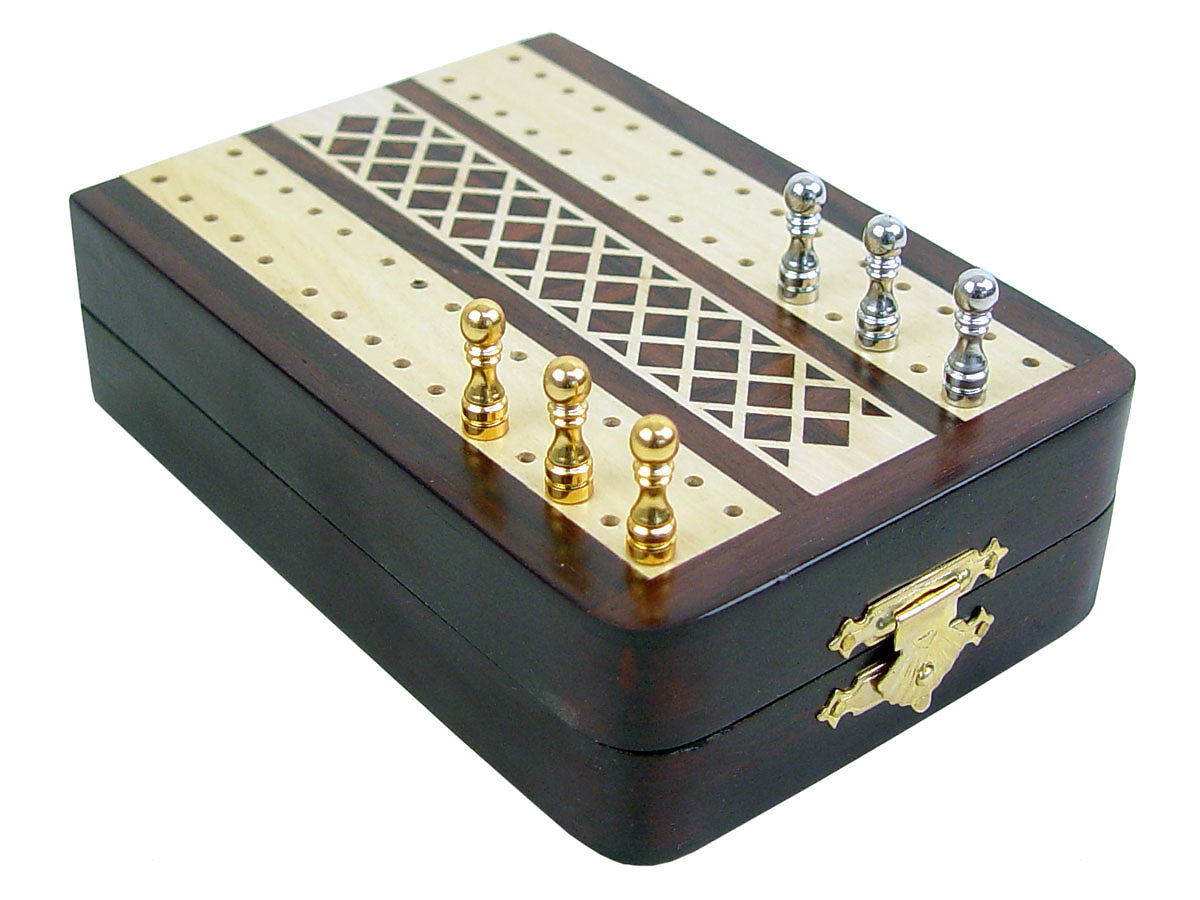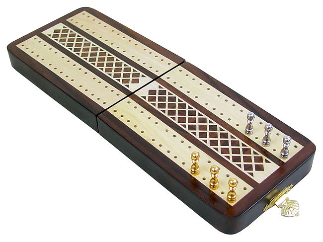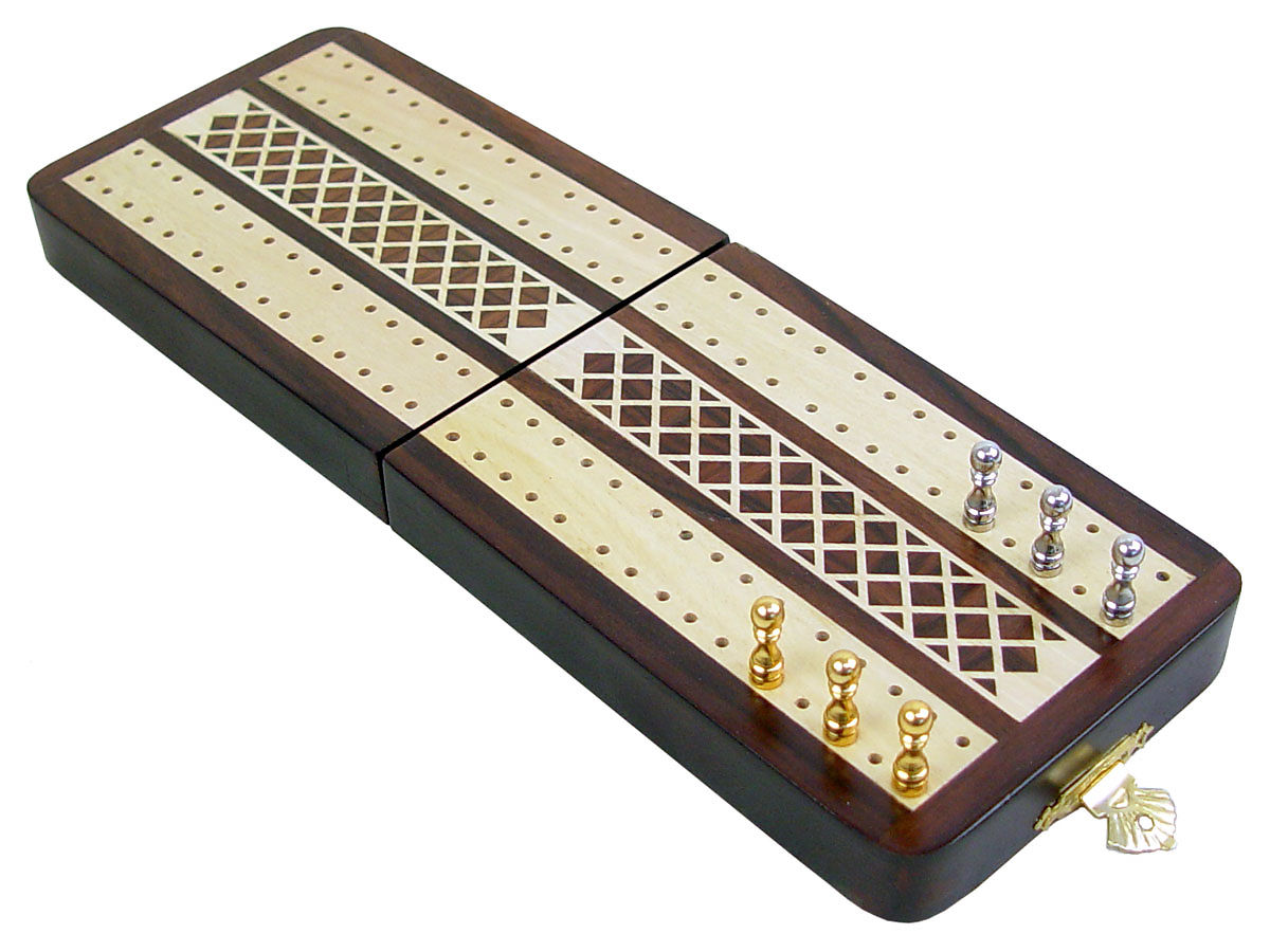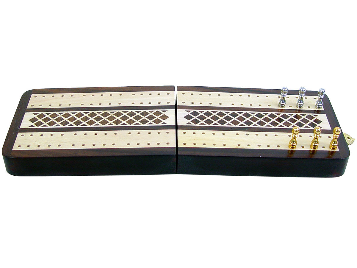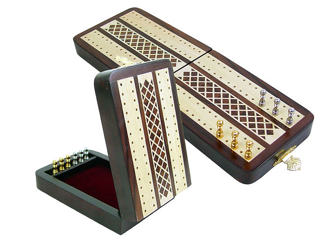 Cribbage Board Store presents exquisite 2 track (60 Points) Artistic Net Design Design Royal Cribbage Board & Box in Folding version. The handmade folding travel cribbage board/box is made of Rosewood and through special inlay process, white maple tracks are inlaid on the board with great precision. Net design inlay work can be seen between 2 tracks.